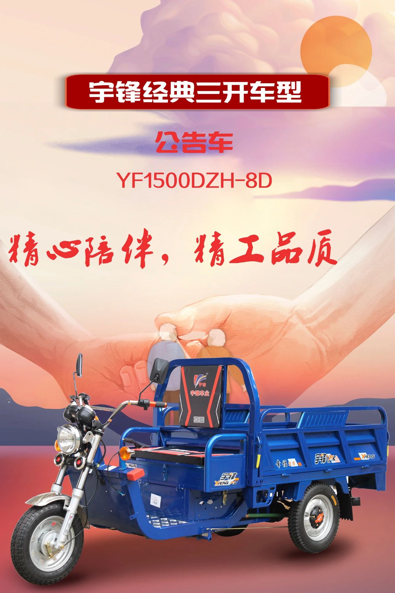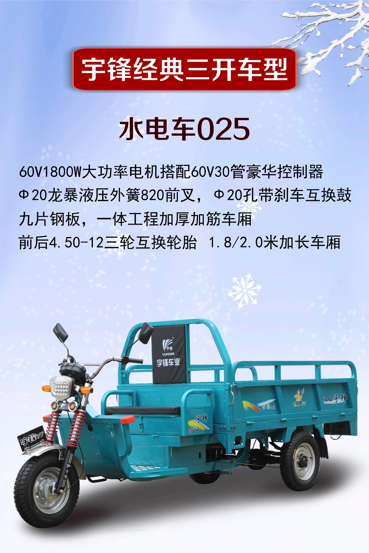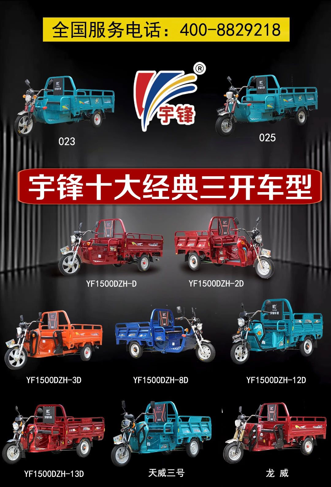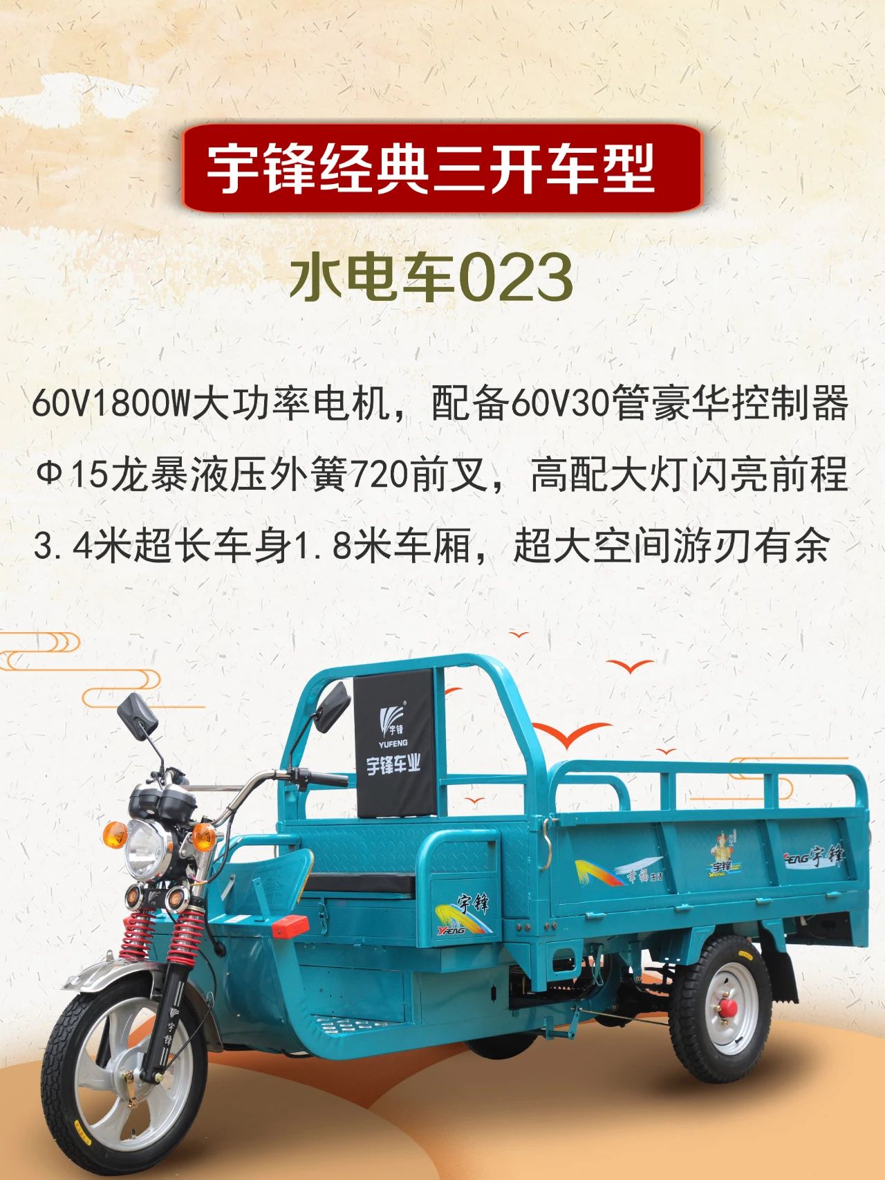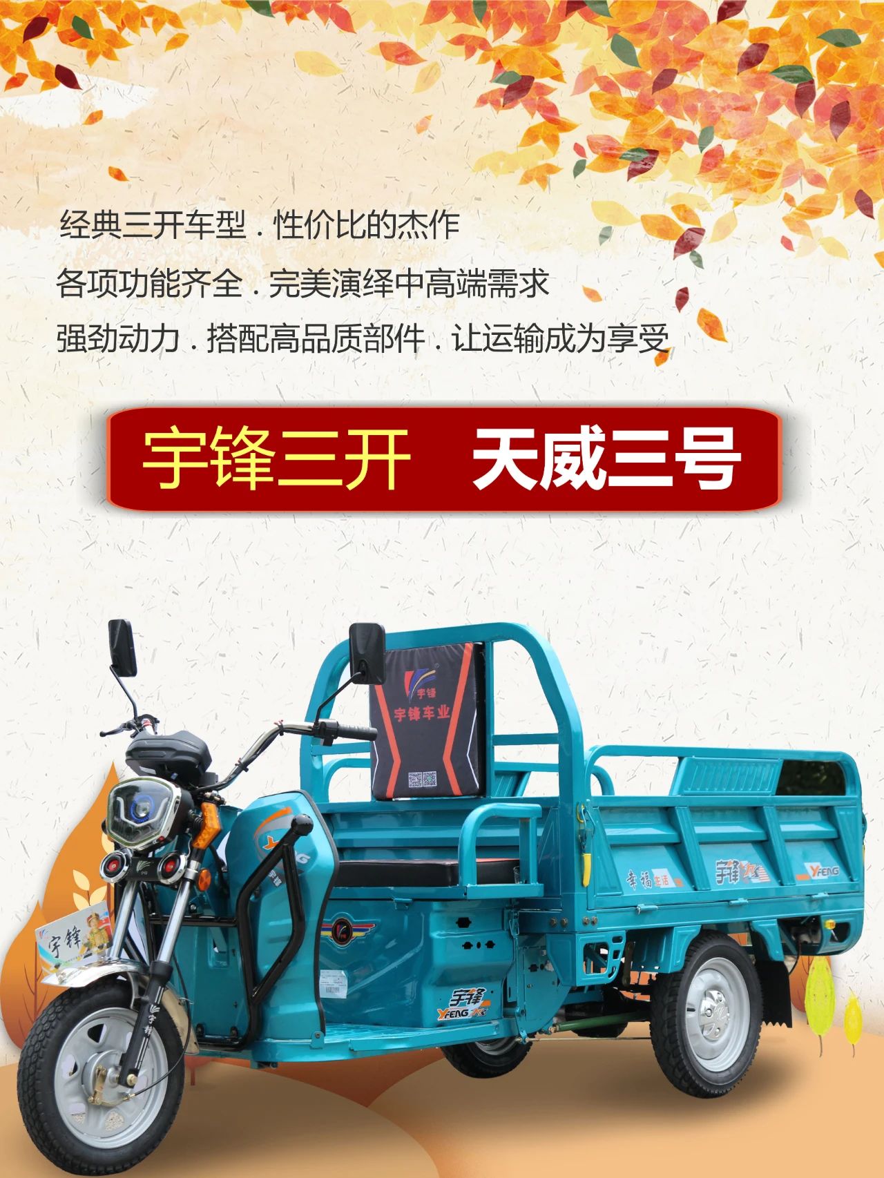 三開系列電動三輪車,是三輪車產品系列中使用最廣泛的車型,26年來,已經有超百萬輛宇鋒三開電動三輪車走進千家萬戶,譬如宇鋒經典的063和021系列,造就了電三行業一個個經典的傳奇。