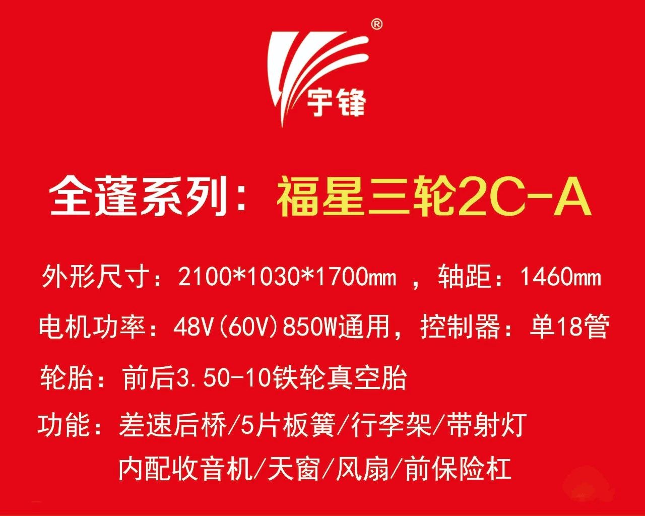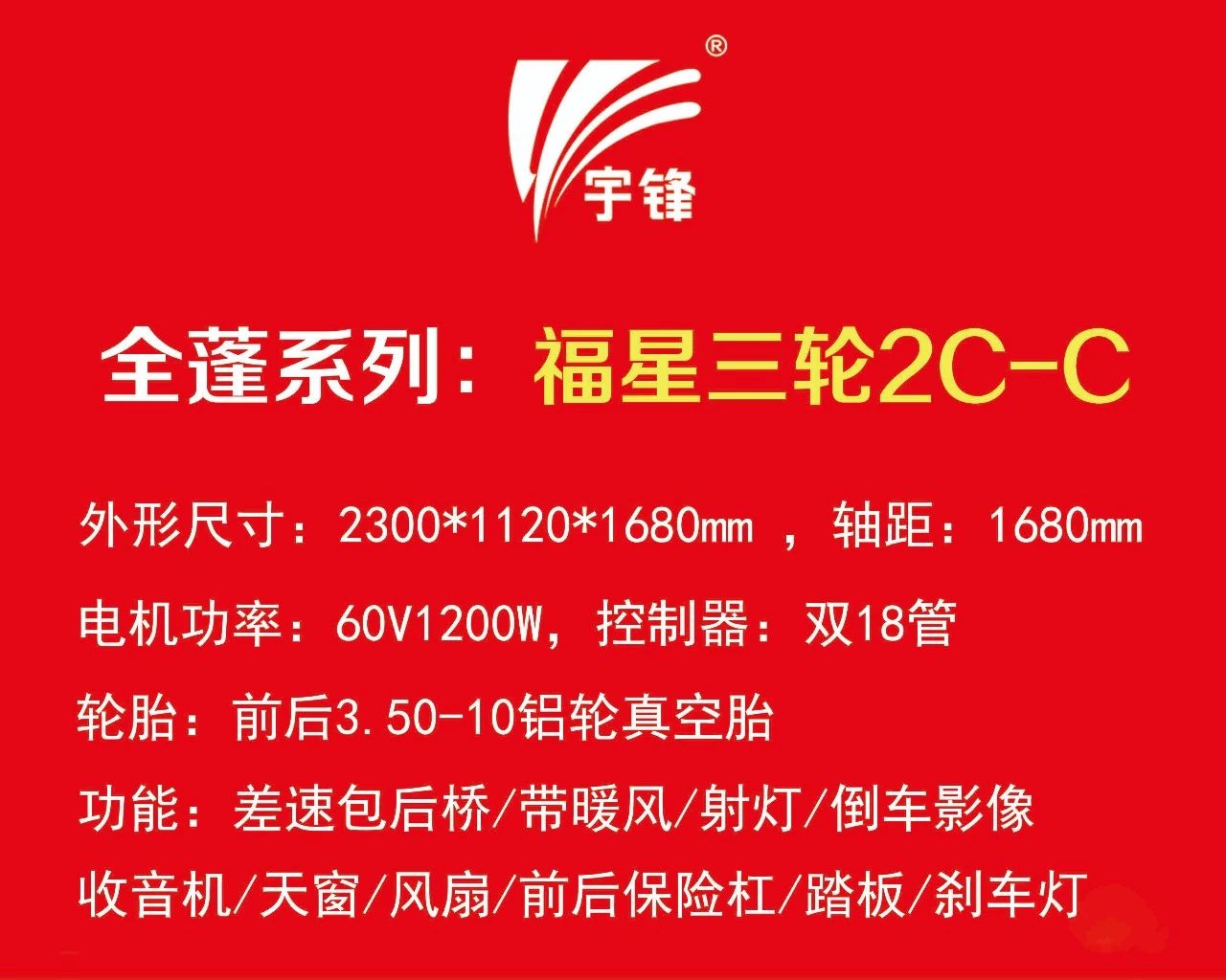 冬天已悄然臨近,寒風夾雜著冰雪的氣息迎面撲來,還好,有了宇鋒篷車,這個冬天不會冷,宇鋒篷車系列為您保駕護航,讓您暢行無阻安全無憂。今天給大家介紹三款宇鋒最新的篷車----福星系列:福星2C-A、福星2C-C和福星皮卡。【1、新款三輪篷車:福星2C-A】 【2、新款三輪篷車:福星2C-C】 【3、宇鋒新款三輪篷車:福星皮卡】