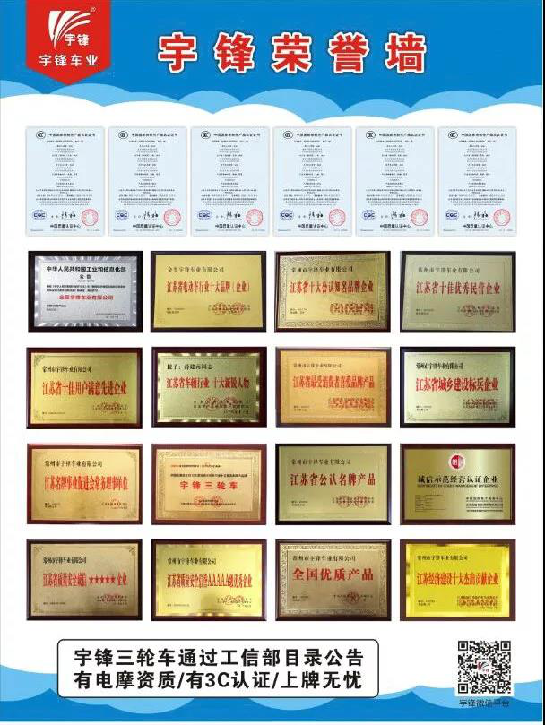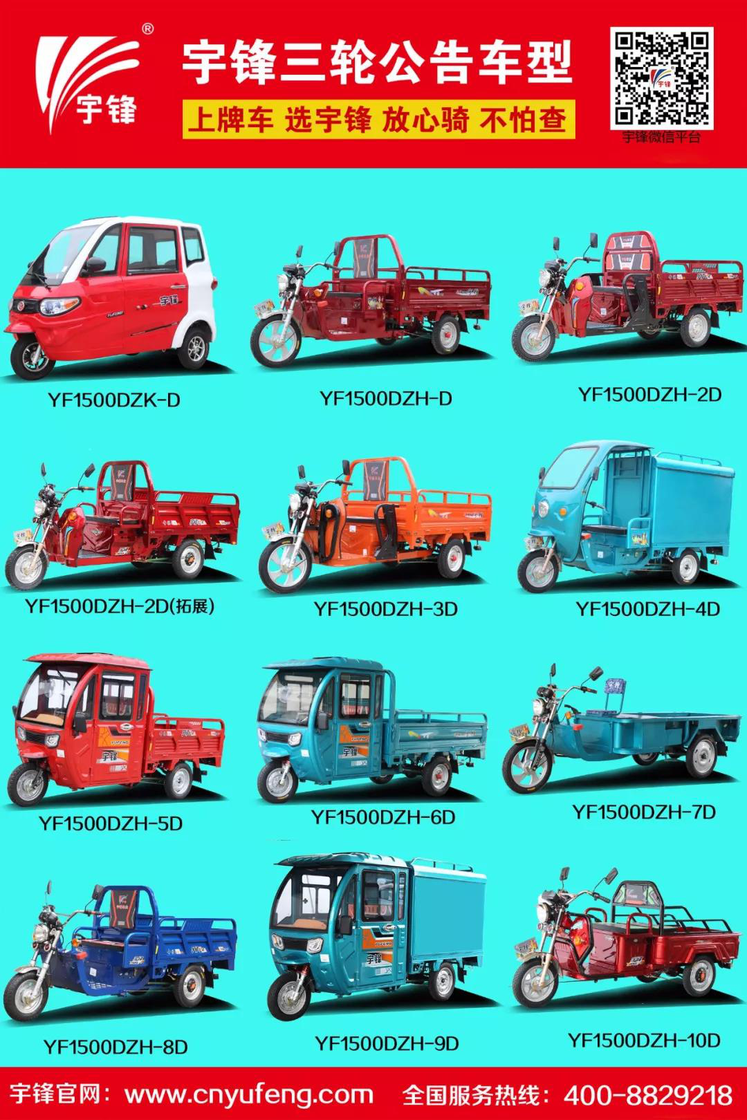 自2016年宇鋒獲得摩托車生產企業資質以來,宇鋒車業從第314批目錄公告開始,幾乎每次新的批次目錄公告,都有宇鋒的新產品的身影,本次重點推介的十幾款有3C認證的上牌三輪車型,倍受消費者的歡迎。
